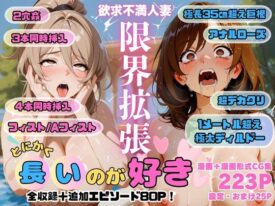 ★各話10P〜15P、合計51Pの体験版有り★PCでダウンロードできます。スマホの場合はブラウザをPC版サイト表示にするとDL可能です。本作品は「とにかく長いのが好き」シリーズの全話と新規書き下ろしエピソード80ページを追加した内容になっています。【収録内容】1.フィットネスジム編(コミック形式)2,媚薬温泉(痴女人妻×巨根リピート編)前編(マンガ風CGノベル形式)3,媚薬温泉(痴女人妻×巨根リピート編)後編(マンガ風CGノベル形式)★追加エピソード★4,限界拡張合宿編(マンガ風CGノベル形式)【発売記念キャンペーン実施】期間限定で30%OFFでご提供予定です♪この機会にぜひ「とにかく長いのが好き」シリーズをチェックしてみてください。【ストーリー】超巨根が理由で過去女性に気持ち悪がられてきた主人公。そんな主人公をフィットネスジムに通うぴちぴちのレギンスを来た人妻二人組が狙います。彼女たちはとにかく「奥」が感じる体質。ポルチオ(子宮口)やアナル(S字結腸)を責められるのがとにかく大好き。極長チンポを持つ主人公と人妻2人の汗だく濃厚セックス開始!媚薬温泉編では、主人公の36cmの巨根が忘れられない人妻達と今度は一泊二日の温泉旅行♪温泉には、体を敏感にさせる効能があるとのウワサががあり、冗談半分で互いの体にお湯を塗り込みます。しかし冗談では済まない効能がこの温泉にはあり・・・人妻エミさんのポルチオ(子宮口)をこれでもかと刺激し怒涛の絶頂!アナル中毒の人妻ナツキさんは巨根を激しく出し入れされ続け、アナルは当然無事で済むはずなくぽっかりと拡張され、アナルローズ(脱肛)も披露!★新規追加エピソード★現改拡張合宿編人妻エミさんの別荘で、プールサイドで大乱交パーティー二穴姦、三本同時挿入、四本同時挿入!フィストファック、アナルフィスト!そして1メートル超えの極太ディルドーを使った限界拡張で人妻2人が快楽の限界に!【収録内容】合計:248ページ内訳(本編223ページ、設定・おまけイラスト:25ぺージ)修正方法:黒海苔【プレイ内容】・媚薬温泉・人妻・超巨根ねじこみ・アナルファック・アナルローズ(脱肛)・射精するアナルローズ・アへ顔・オホ声・フィストファック・アナルフィスト・二穴姦・3本同時挿入・4本同時挿入■本作品について・本作は全編、Stable Diffusionで作成をしたAI生成画像になります。・AI特有の体の崩れなどは極力手描きで修正をしています。・本編の内容はすべてフィクションになります。・登場するキャラクターや団体は実在いたしません。・犯罪や違法行為を助長する意図はございません。・登場人物の年齢は18歳以上です。■作者SNSX(Twitter):@virtues2026pixivアカウント名:でゅなみす